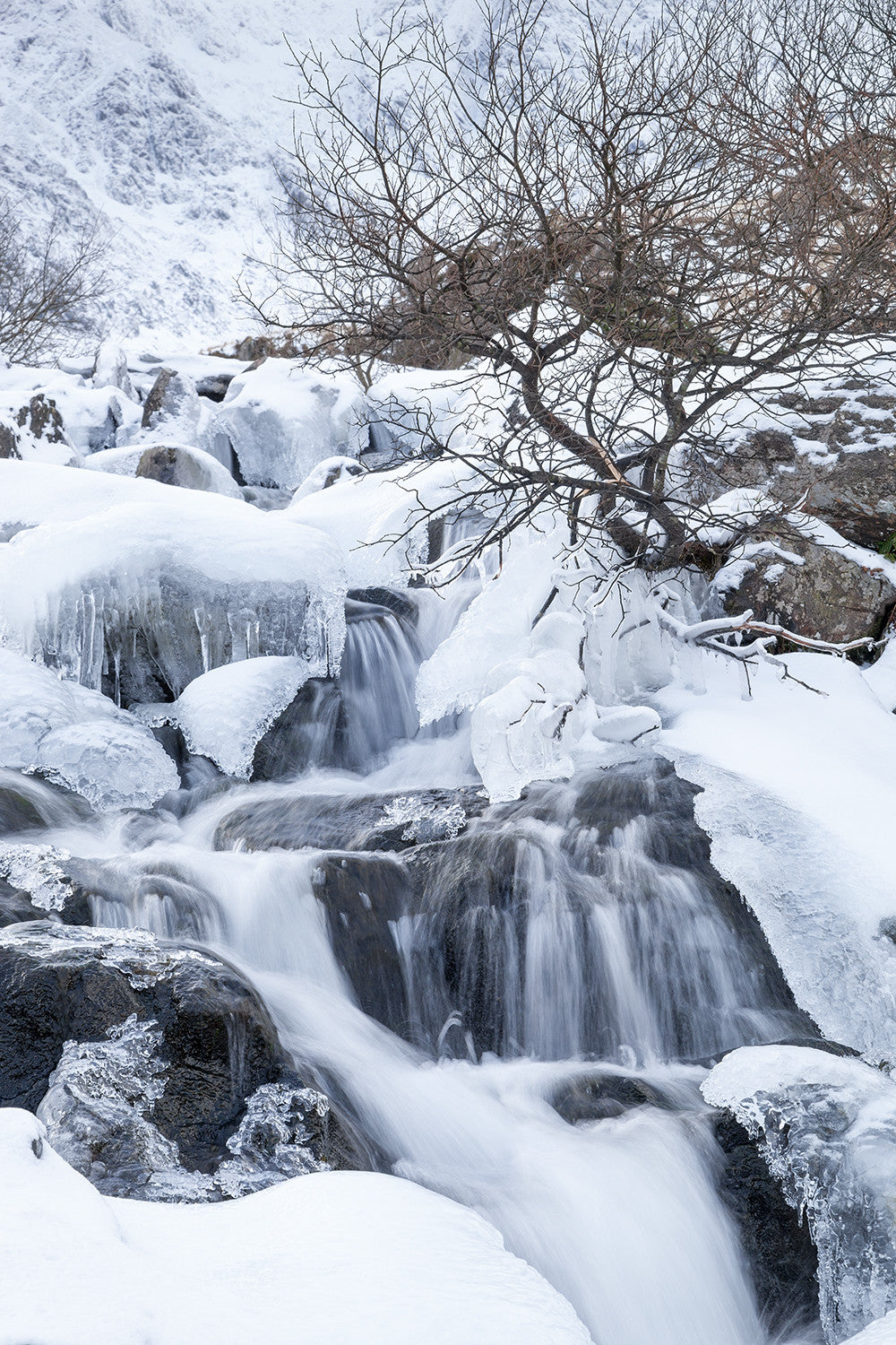 This popular waterfall, located next to the path on the way up from Llyn Ogwen to Llyn Idwal, is covered in ice and snow but some water still manages to flow.